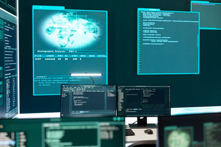 Empty cyber operations center for governmental hacking and threat detection. Equipped with technology for monitoring cyber threats, cybercrime, and safeguarding digital information.
