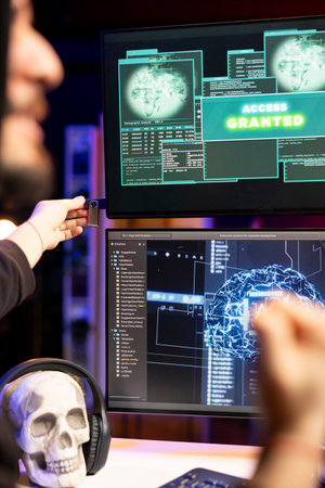 Hacker in cyber safehouse using AI to break into secure computer system and bypass security. Evil technician at home PC desk uses deep learning to attack weak spots in company networks