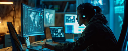 The picture of the cyber security is working inside the room filled with monitor, the cyber security is the job that require skills like technology knowledge, data management and experience. AIG43.