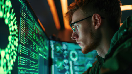 A man is looking at a computer screen with green text. He is wearing glasses and a hoodie
