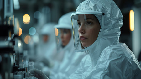 Team of Research Scientists in Sterile Suits Working with Industrial Machinery in the Laboratory