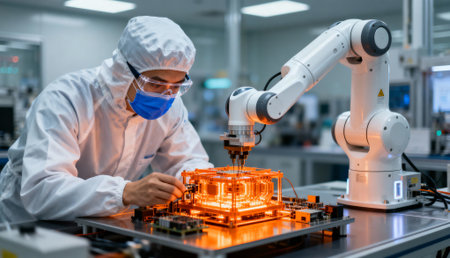 Scientist wearing protective suit and mask operates a robotic arm to assemble or inspect advanced electronic components in a modern high-tech laboratory environment.