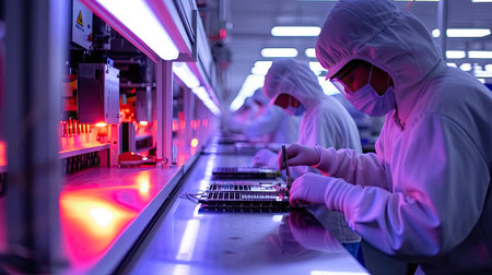 senior workers in a modern factory producing and assembling electronic high-tech components, Generative AI
