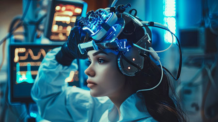 A futuristic vision unfolds as a young scientist tests advanced neural technology, surrounded by glowing consoles and cutting-edge equipment. Embrace the dawn of a new era. Generated A.I.