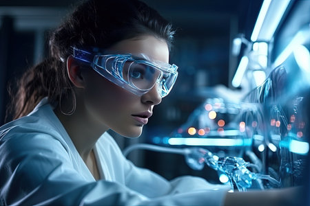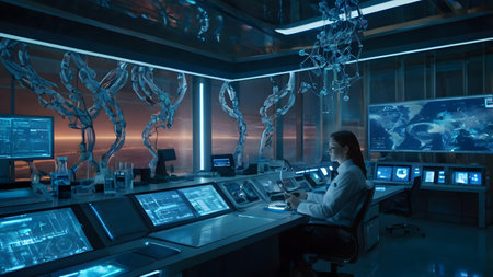 Focused scientist working in a high-tech lab with futuristic technology and holographic displays.