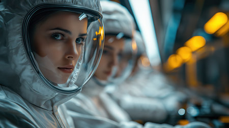 Female scientist in futuristic protective suit and helmet