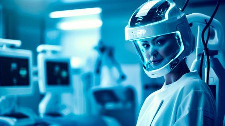 Woman wearing futuristic helmet in room with medical equipment in the background. Generative AI.