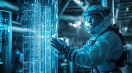 Scientist wearing futuristic suit examining data on transparent digital display in high tech laboratory