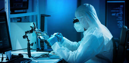 The scientist works in a modern scientific laboratory for the research and development of microelectronics and processors. Microprocessor manufacturing worker uses computer technology and equipment.