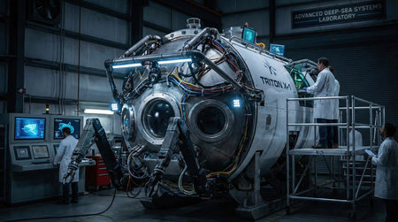 Front view of a complex deep-sea submersible with exposed mechanical arms, wires, and round observation windows, showcasing advanced underwater technology in a scientific laboratory