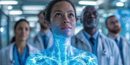 Medical team observes digital hologram of human anatomy