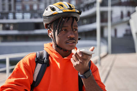 Delivery man wearing bicycle helmet and delivery backpack using smartphone