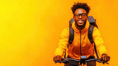 A young man smiles widely while riding a bicycle. He wears a vibrant orange hoodie and glasses, with a backpack attached to the bike. The sunlit background adds to the cheerful atmosphere.