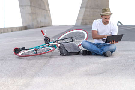 Portrait of young man, sitting on ground with legs crossed and working on laptop while resting