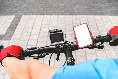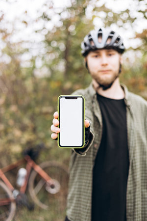 Cyclist in helmet holding smartphone with blank white screen and showing it.