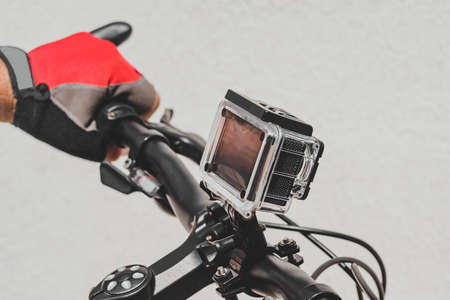Close-up, the hands of a guy in red gloves on the handlebars of a bicycle with an action camera. On a light background