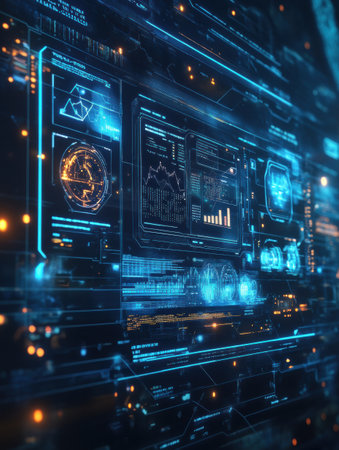 A captivating futuristic digital dashboard showcasing glowing interfaces and high-tech elements ideal for themes of data analysis, cybersecurity, and technological advancements.