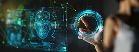 Young girl using face recognition system. Personal data information being analyzed and verified.