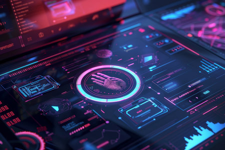 This image showcases a high-tech digital interface featuring vibrant neon visuals and intricate data representations, ideal for technology and innovation themes.