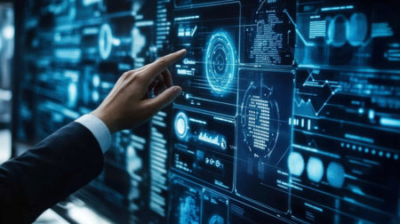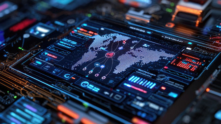 High-tech digital interface showcasing data visualizations and analytics. Modern design elements highlight a futuristic workspace focused on technology and performance metrics.