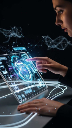 Technology showing woman engaged with advanced digital holographic display showing complex data...