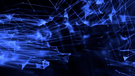 Abstract plexus atom connections through thread with particles blue