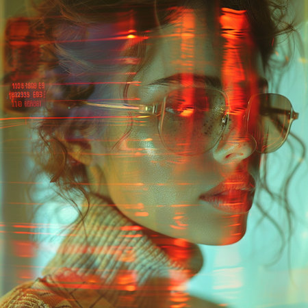 Portrait of a beautiful young woman in glasses with glitch effect.