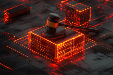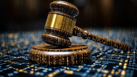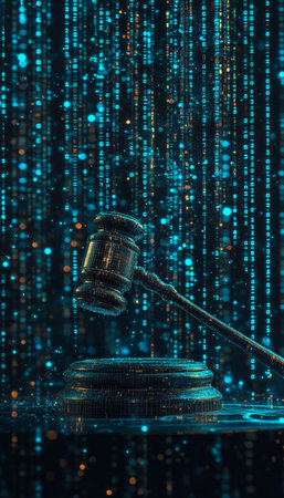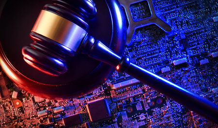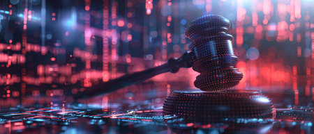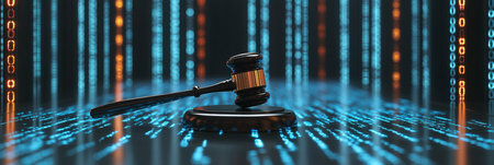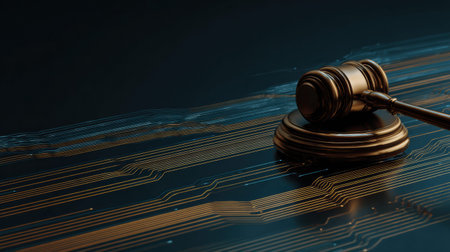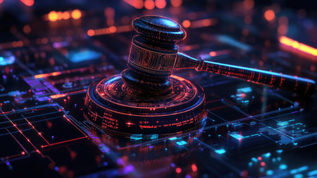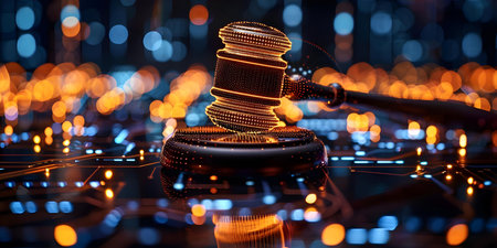 A wooden judge's gavel set against a backdrop of glowing digital circuits, symbolizing law and technology.