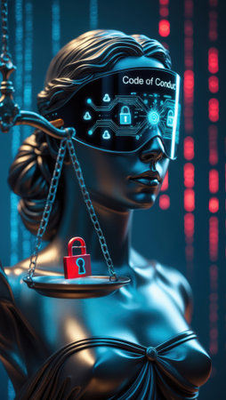 Futuristic depiction of Lady Justice wearing a VR visor with Code of Conduct text and digital lock icons. Scales hold a padlock, symbolizing cybersecurity and digital ethics.
