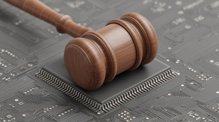 A wooden gavel rests on a circuit board, symbolizing the convergence of technology and law in the modern justice system, reflecting legal authority and innovation.