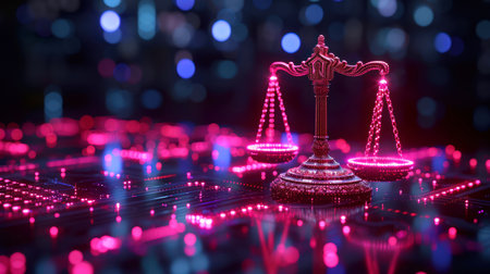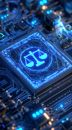 An image displays a glowing scales of justice icon embedded in a circuit board, suggesting legal technology. The dark blue color palette and blurred background create a tech-focused ambiance. The image could be used in projects related to law, business, and technology, conveying modern concepts.