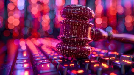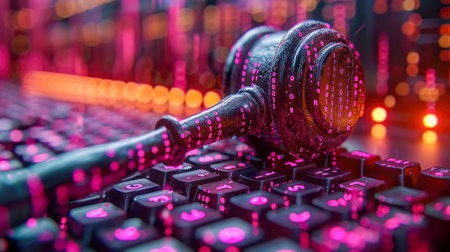 A digital gavel with binary code patterns placed on a keyboard, glowing in pink and orange light. Concept of cyber justice and digital law enforcement.