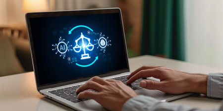 A computer screen displays balanced scales symbolizing online regulation. The scene highlights digital law in a tech-focused environment.