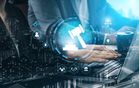 Judge gavel placed next to a laptop on a desk, with legal tech icons overlayed. Modern law concept.