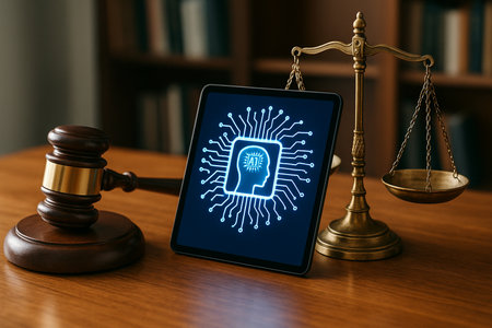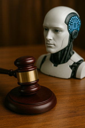 A legal gavel is juxtaposed with a digital representation of artificial intelligence, symbolizing the intersection of law and technology.