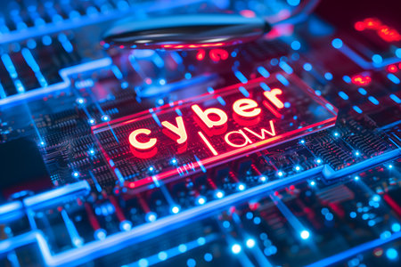 A polished wooden judge gavel rests on a glowing circuit board with blue and gold lines, symbolizing cyber law and data privacy regulations.