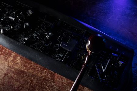 Wooden Judges gavel and keyboard. Close up. Legal rights to use the names of mail and websites.