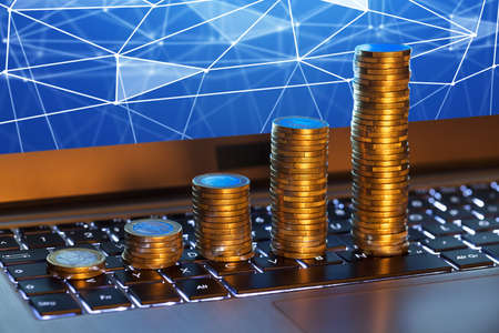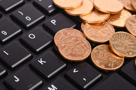 money coins on laptop computer