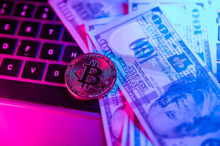 Bitcoin coin with laptop and us dollars in neon. Cryptocurrency investment concept