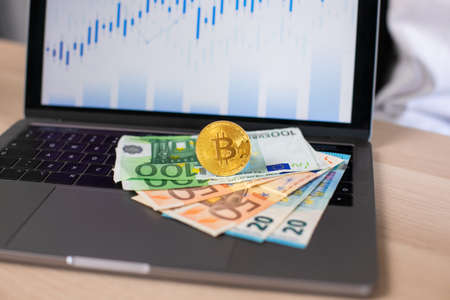 Euro currency and bitcoin on a background laptop with charts. Bitcoins growth chart.