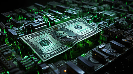 This visually striking image features a glowing dollar sign integrated into a circuit board, symbolizing the blend of technology and finance.
