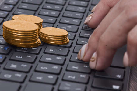 Close-up Of A Stacked Golden Coins On Laptop Keypad