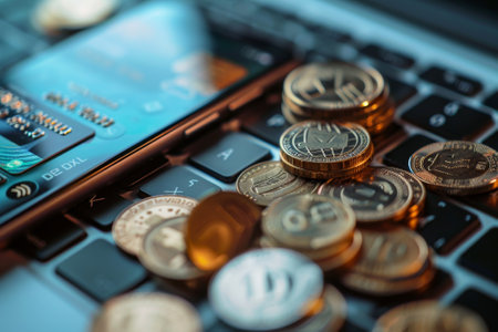 A cell phone with a credit card on top of it and a pile of gold coins next to it