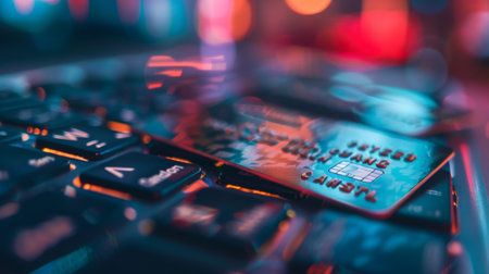 This image of a credit card on a keyboard symbolizes the growth of online shopping, with vibrant bokeh lights creating an enchanting atmosphere, enhancing the excitement of this convergence