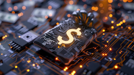 Close-up view of a glowing dollar symbol set on a circuit board, representing the fusion of technology and finance in the modern economy.