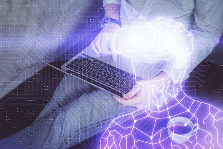 Man with computer background with brain theme hologram. Concept of brainstorm. Double exposure.