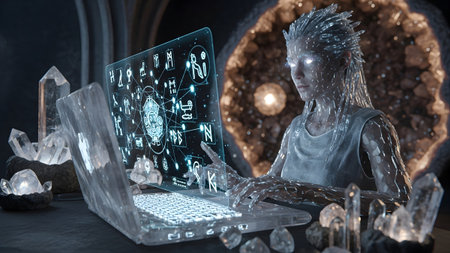 A woman with an icy appearance uses a transparent ice laptop displaying ancient symbols and data.
