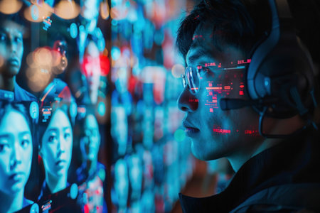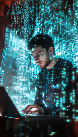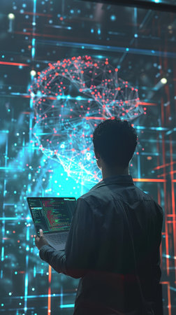 A man engaged in online surfing amidst a futuristic digital landscape of advanced technologies