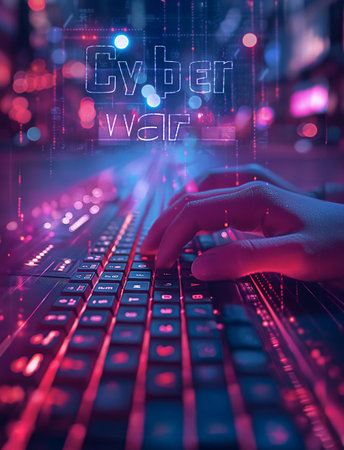 Close-up image of cyber warrior's hand using high-tech holographic pink light keyboard on phone to fight in cyber war.