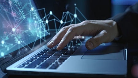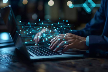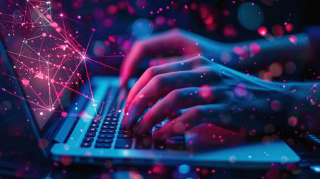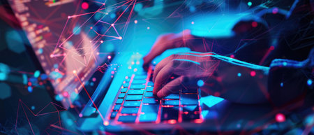 A person is typing on a keyboard with a glowing background of lines and dots. Concept of technology and modernity, as well as the idea of being connected to the digital world